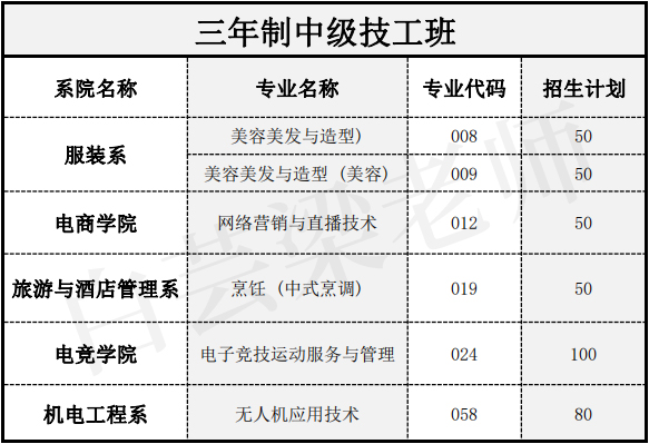 2023年我校面向初(高)中应(往)届毕业生开设三年制高考班、中技班、高级技工+成人大专双学历和预备技师+成人本(专)科双学历层次。